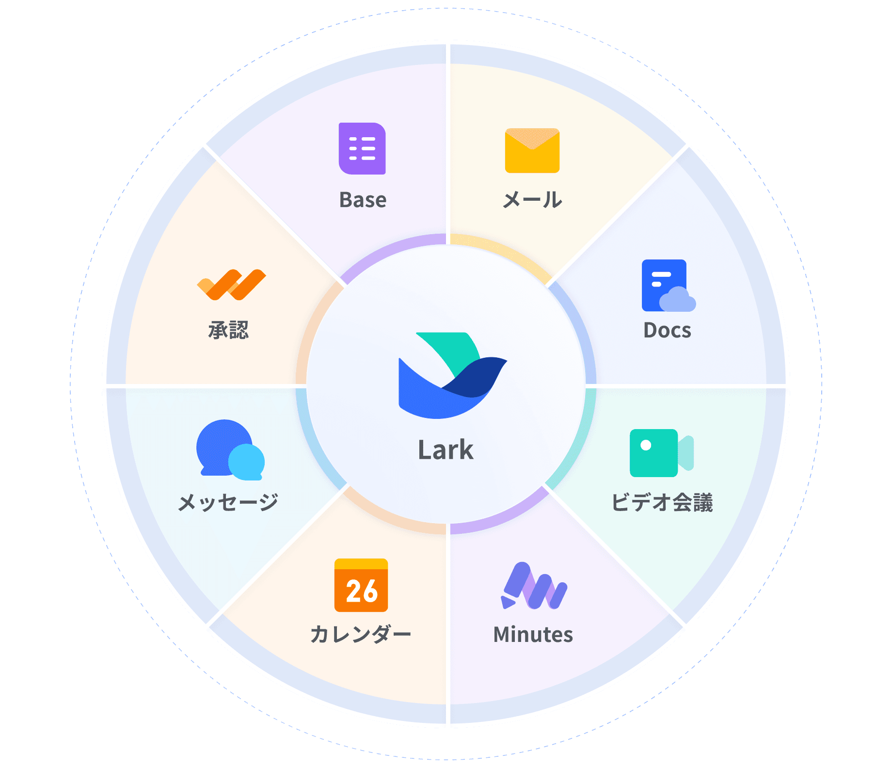Lark は、現場に必要なツールがオールインワン。コミュニケーションに不可欠なチャットを起点に、メール・カレンダー・ビデオ会議・ドキュメント・ワークフロー・バックオフィス機能などをシームレスに融合。生産性が圧倒的に向上します。