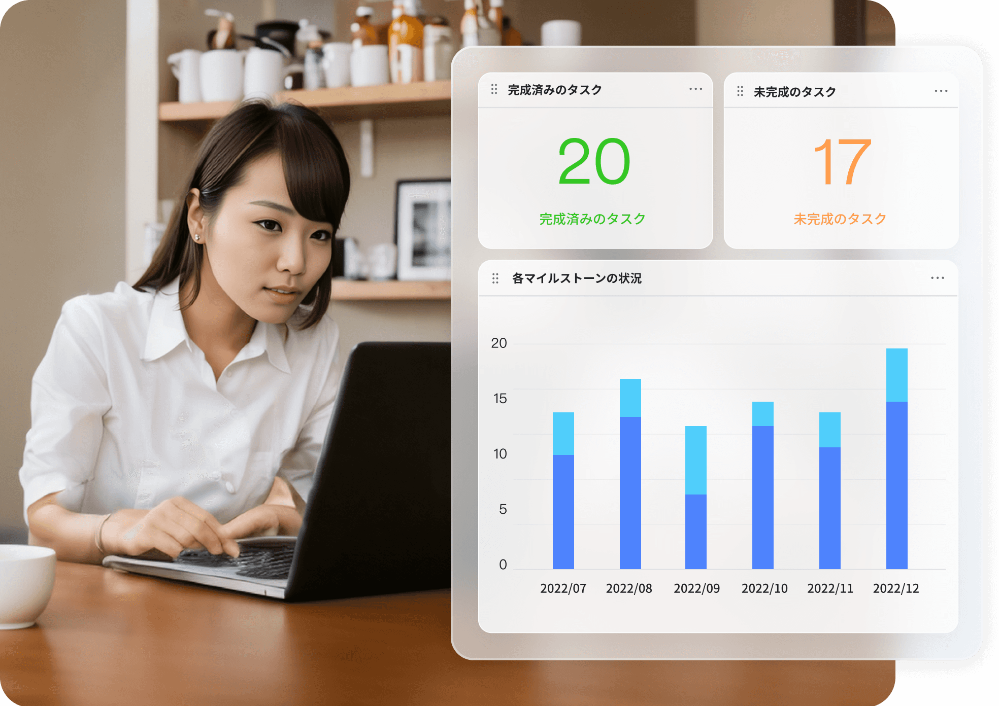 売上データや、品質管理、スタッフの勤務状況 など、経営に必要な全ての情報をLark に集約 可能。経営目標を算出するサポートになった り、品質管理を徹底できたり、人事評価を公平 に行なったりすることができます。